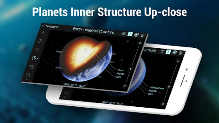 The app is a spectacular 3D model of our Solar system showing planets in real time, stars, moons, satellites, asteroids, comets, dwarf planets and other celestial bodies. All celestial bodies are represented in their correct positions in real time. General and detailed information, inner structure and various astronomy facts are provided in an understandable way.