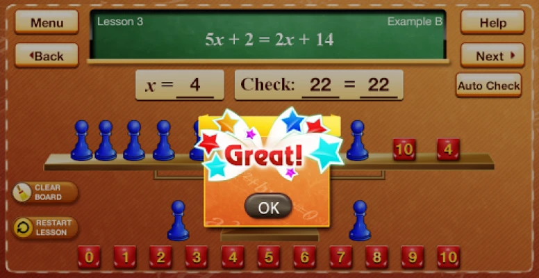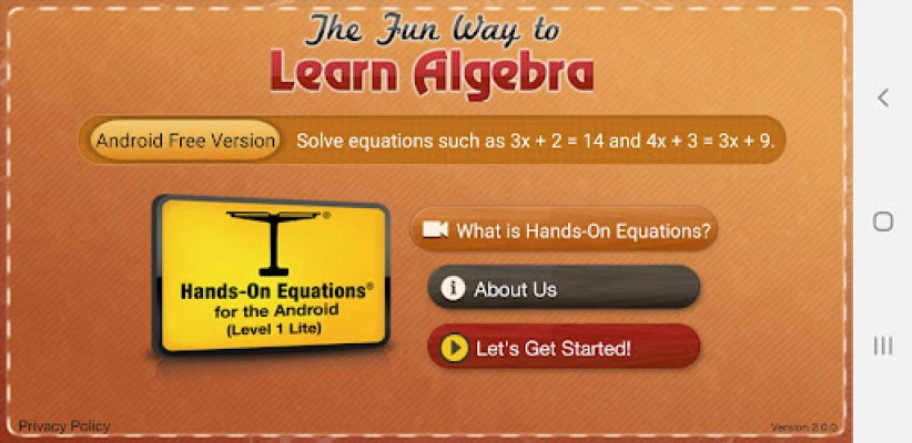This is the FREE version of the Hands-On Equations 1 app. It is perfect for introducing algebra to children aged 8 and up in an entertaining and engaging way. The app will boost their self-esteem and give them the confidence to tackle even more complex equations, as found in Hands-On Equations 1, 2, and 3.