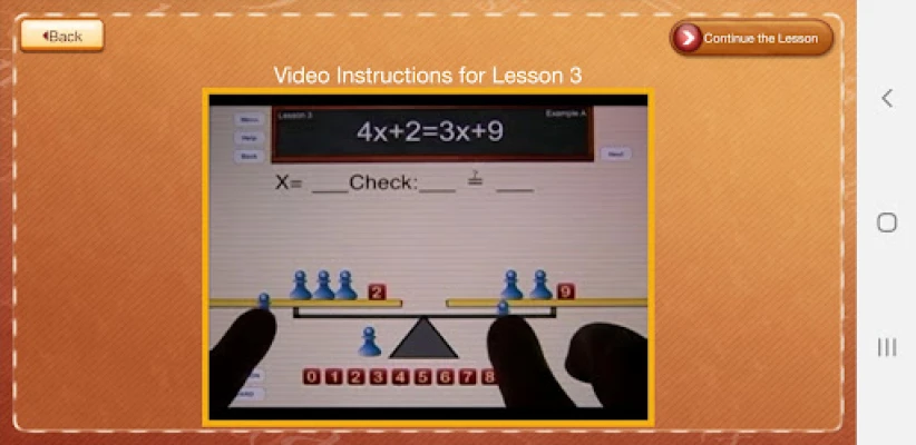 • Beginning with Lesson 2, the student places the game pieces on the balance scale to represent the two sides of the equation.